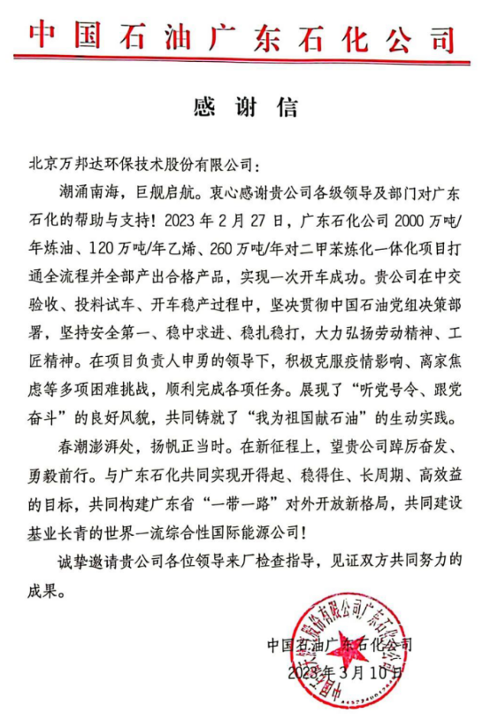 近期,萬邦達收到了來自中國石油廣東石化公司的感謝信,對我公司在廣東石化公司2000萬噸/年煉油、120萬噸/年乙烯、260萬噸/年對二甲苯煉化一體化項目中交驗收、投料試車、開車穩(wěn)產(chǎn)過程中的表現(xiàn)給予了高度評價。